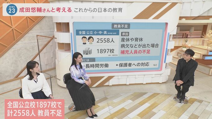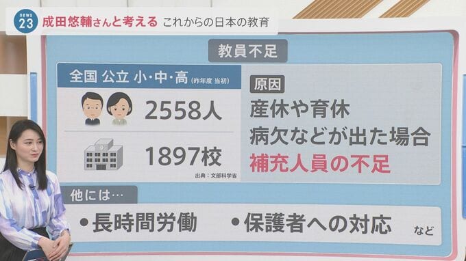 文部科学省によりますと、2021年度は全国の公立学校1897校で合わせて2558人も教員が不足していました。原因として考えられるのが、産休や育休、病欠などが出た場合の補充人員の不足、他には部活動などの長時間労働や保護者への対応などが考えられるということです。