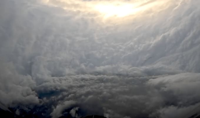 アメリカ軍が公開した映像では、WC-130Jが中心付近の雲を抜け、メリッサの目に入る様子が確認できます。巨大な壁のようにそそり立つ雲の上は、雲から太陽の光が透けて見えています。