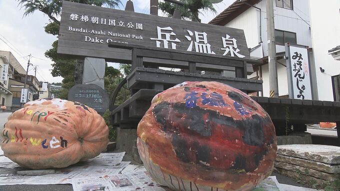 イラストを描いたのは、地元の安達太良小学校の全校児童およそ40人。この大きなカボチャは、お隣の大玉村で育てられたもので、子どもたちは、50個ほどの大きなカボチャに、思い思いにイラストを描いていました。ハロウィーンの時期に合わせて温泉街を盛り上げようと、毎年行われていて、今年で21回目になります。