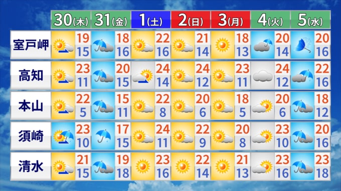 30日の高知県内は、日中を中心に高気圧に覆われて晴れるところが多いですが、気圧の谷や湿った空気の影響で次第に曇り、西部では夜から雨の降るところがある見込みです。