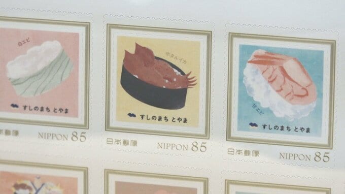 「すしのまちとやま」をPRするオリジナルフレーム切手の贈呈式が富山市役所で行われました。パステルカラーで寿司ネタなどが描かれた切手は、1600枚限定で10月31日から富山県内の郵便局などで販売されます。日本郵…