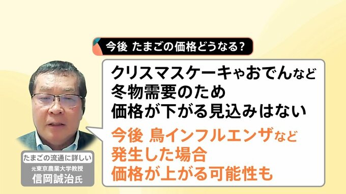 たまごの価格は2025年だけでもかなり上がっていますが、たまごの流通に詳しい元東京農業大学教授の信岡誠治氏によると、「クリスマスケーキやおでんなど冬物需要のため、価格が下がる見込みはない。今後、鳥インフルエンザなどが発生した場合、価格が上がる可能性もある」といいます。