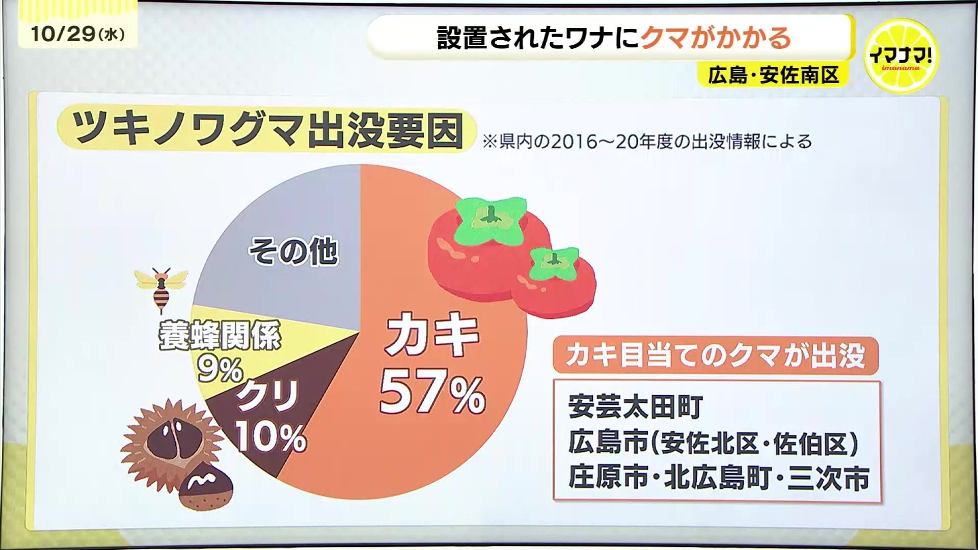 広島県内の出没要因の1位は「カキ」です。ほかの「クリ」や「養蜂関係」と比べても圧倒的な割合であることがわかります。