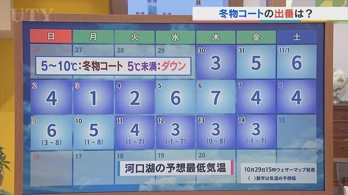 ですから、冬物コートはもうもちろんのこと、ダウンを用意してもらってもいい気温となりますので、これからやっぱり寒さ厳しくなってきますから、特に朝方は