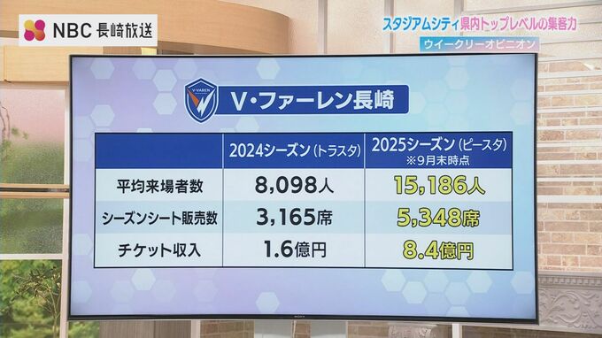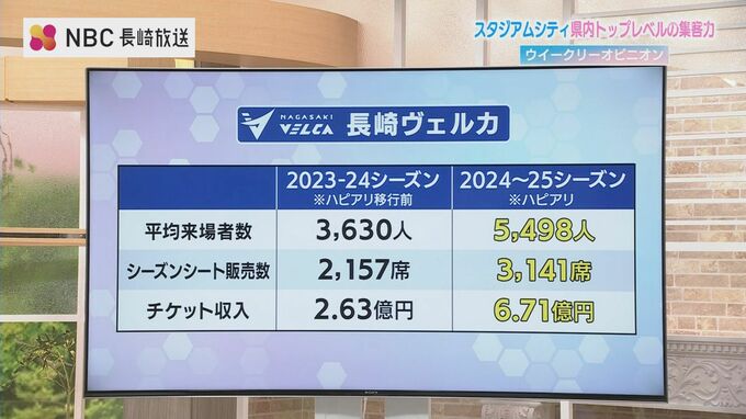 【平】V・ファーレン長崎でいうと、スタジアムシティと以前のホームだったトランスコスモススタジアムを比較すると、平均来場者数、シーズンシート販売数、チケット収入が大きく伸びています。