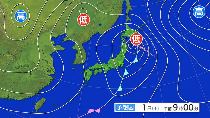 31日と11月1日の予想天気図を見ると、四国の南に発生する前線は発達しながら北上し、1日は東北の東に低気圧が発生するでしょう。そのため広い範囲で雨が降る見込みですし、等圧線の間隔が狭まるため、風も強まり、沿岸部は横殴りの降り方となりそうです。