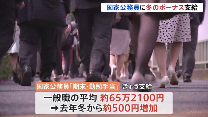国家公務員に冬のボーナスが支給されました。今回の支給額は、一般職の平均でおよそ65万2100円でした。民間企業のボーナスにあたる国家公務員の「期末・勤勉手当」がきょう支給され、今回の支給額は、一般職の平均…