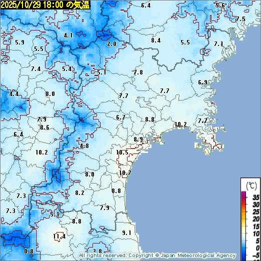 推計気象分布は、気象庁ホームページに載せられている図で、毎正時の各地の天気や気温、日照時間を数値と色で現したものです。例えば29日午後6時の宮城県の気温の図を見ると、平地では広く10度を下回ってきていて、奥羽山脈の標高の高い山では0度前後になっているということが分かります。