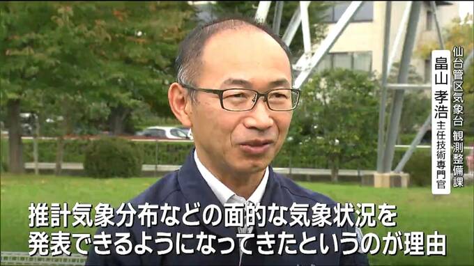 仙台管区気象台 観測整備課 畠山孝浩 主任技術専門官「アメダスやレーダー、気象衛星ひまわりなどの最新の観測技術を用いまして、推計気象分布などの面的な気象状況を発表できるようになってきたというのが理由になります」