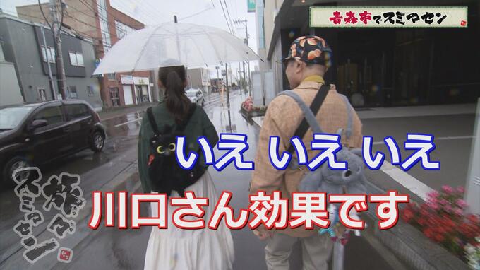 そぼ降る雨の中、川口さんと小野寺アナのお散歩がスタートします。傘を差しながら通りく2人に道行く人から声援が。