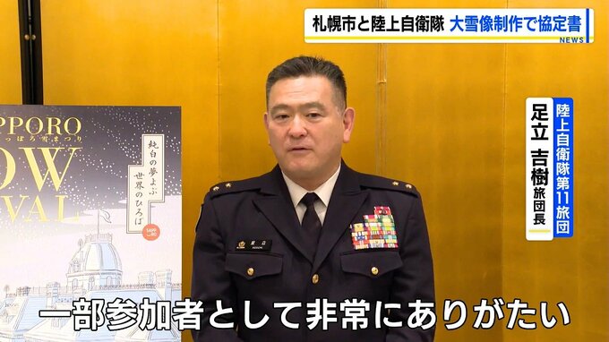 調印式には、札幌市の秋元市長と陸上自衛隊第11旅団の足立吉樹旅団長らが参加し、大雪像2基の制作や雪の輸送などに協力する協定書に署名しました。