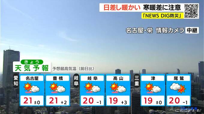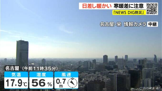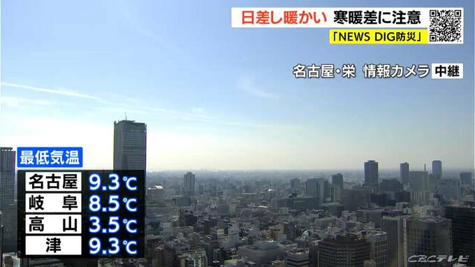 正午頃の名古屋市内は、雲が少なく、よく晴れています。けさの最低気温は、名古屋や津で9.3℃、岐阜で8.5℃と、きのうに続いて寒い朝になりました。