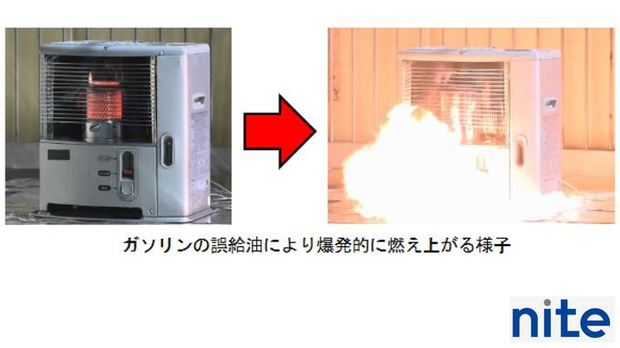 寒さが増し、石油ストーブやファンヒーターを使い始める季節。製品評価技術基盤機構(NITE)に過去5年間に寄せられた事故の中には、「ガソリンの誤給油」によるものも含まれています。NITEでは、ガソリンを誤って給油すると爆発的に燃え上がるおそれがあるとして、厳重な注意を呼びかけています。