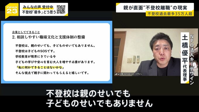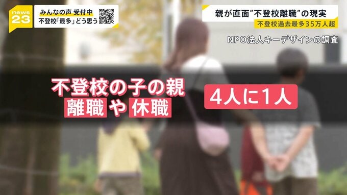 不登校の子どもを持つ親、約400人を対象に行った調査では、4人に1人が離職や休職をせざるを得なかったという結果に。この調査を行ったNPOの代表は、「働きながら不登校の子どもを支えられる社会づくりが必要だ」と訴えます。