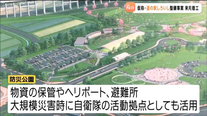 仮称「道の駅しろいし」は約12.2ヘクタールの敷地に地場産品の販売や飲食施設に加え子育て支援施設などが整備されます。敷地内には、防災公園も整備され、緊急時には物資の保管やヘリポート、避難所としても利用でき、大規模災害時には自衛隊の活動拠点としても活用されます。