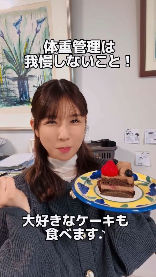 小倉さんは「ダイエットは、好きなものを我慢しすぎないバランスがポイントです」と綴り、大好きなケーキも我慢せずに食べて、「前後の食事をちょっと控えめにして調整しています。」とのことです。
