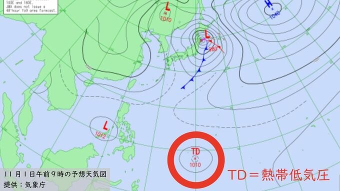 気象庁の予想天気図によりますと、あさって(1日)午前9時の天気図では、カロリン諸島に“台風のたまご”=「熱帯低気圧」が発生する見込みです【画像①】。