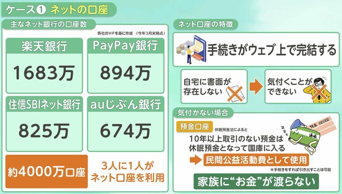 ネット口座は手続きがウェブ上で完結するので、自宅に書面などが存在せず、口座があること自体気づかれない場合もあります。