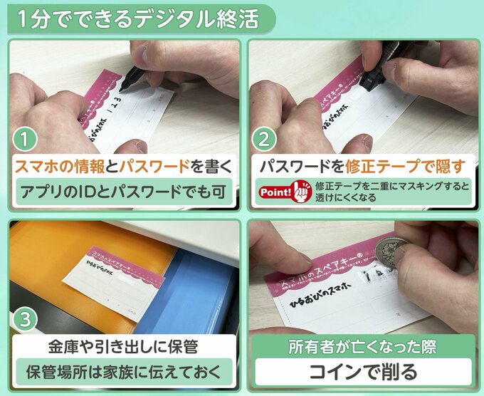 また、万一に備えパスワードはそのまま数字を書くのではなく、「結婚記念日」や「ペットの誕生日」など「言葉」で残しておくのもおすすめ。
