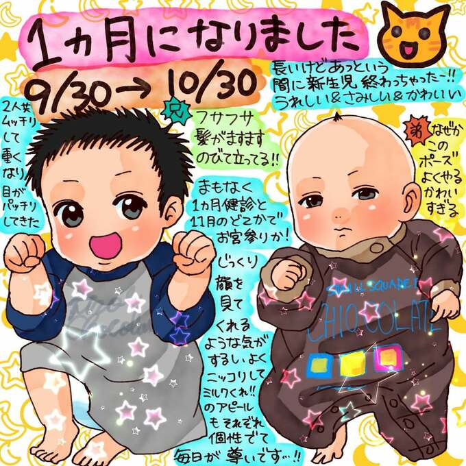 翔子さんは「10/30 ついに双子 一カ月!」「あっという間に新生児期終わってしまった」と報告。絵日記には「うれしい&さみしい&かわいい」と感情がないまぜな様子を綴っています。