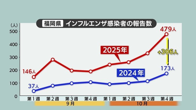 福岡県によりますと、10月26日までの1週間に報告された県内のインフルエンザ感染者数は479人です。