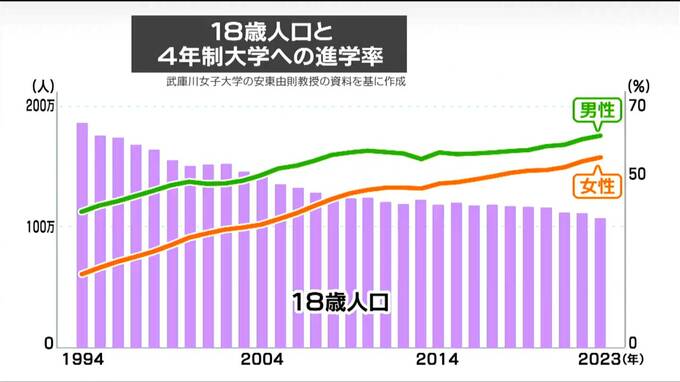 武庫川女子大学の安東教授のデータによりますと、全国的に大学進学率は男女ともにゆるやかに上昇しています。一方で18歳人口は減少が続いていて、この傾向は今後も継続すると見込まれています。
