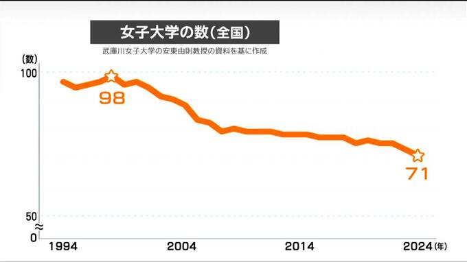 こうした影響を特に受けているのが「女子大学」なんですね。全国の女子大学の数は1998年の98校がピークでしたが、共学化や募集停止などで2024年には71校と約3割減っています。