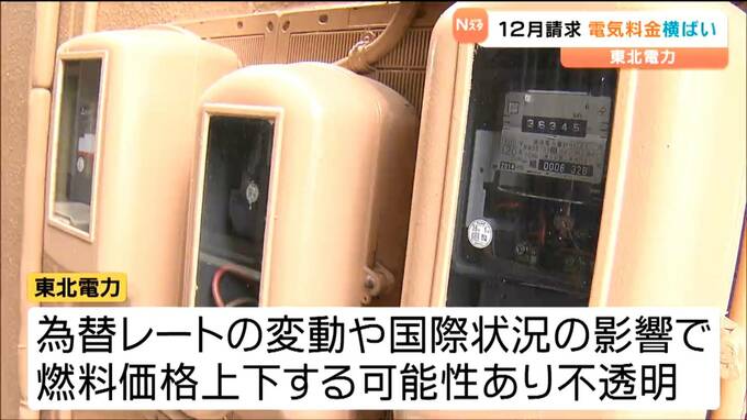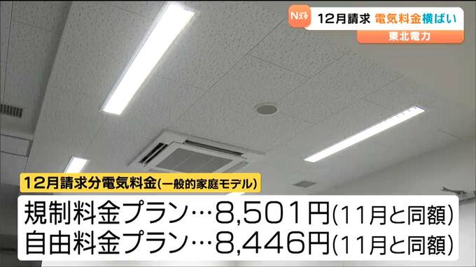 東北電力によりますと、12月請求分の一般的な家庭モデルの電気料金は、規制料金のプランで8,501円で、11月請求分と同じでした。自由料金のプランも11月と同じで、8,446円となっています。