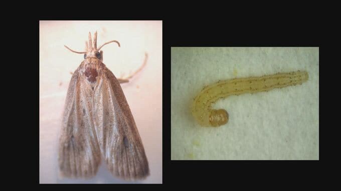 悪さを働くのは蛾の幼虫の「メイチュウ」です。茎の中心部に入り込んで周りを食べるため穂が実らず、黒っぽく変色し枯れてしまったものが…。