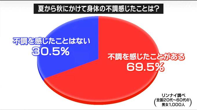 全国20代~60代男女1000人生活機器メーカーの「リンナイ」が全国の20代~60代の男女1000人を対象として「秋バテ」に関する意識調査では不調を感じたことがあると回答した人は全体の約7割に上りました。