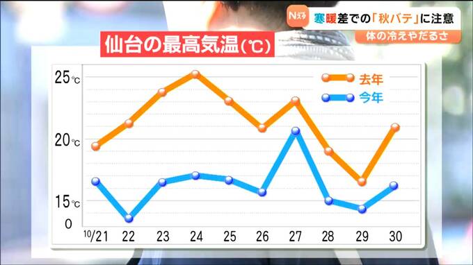 色づいた木々もみられ、秋が深まる仙台市内。10月20日からは寒さを感じる日も増えてきました。10月下旬の仙台の最高気温を去年と比べると、2025年は20℃に届かない日が多く、連日、2024年よりも低く推移しています。