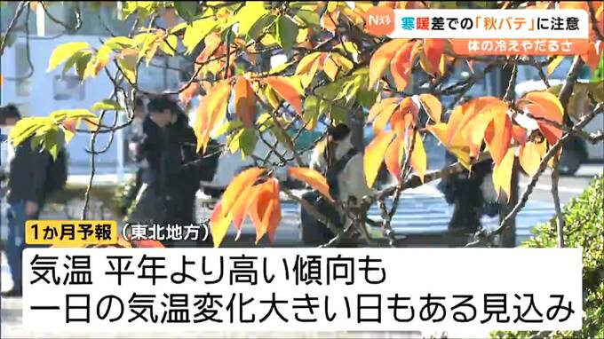 仙台管区気象台が発表した1か月予報によると、向こう1か月は平年より気温が高い日が多い予想となっていますが、一日の気温の変化が大きい日もある見込みです。引き続き、「秋バテ」に注意が必要です。