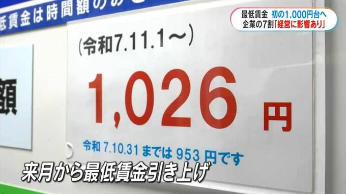 あさって11月から鹿児島県内の最低賃金が初めて1000円台に引き上げられます。県内の企業およそ300社へのアンケート調査で、7割以上が「経営に影響がある」と答えたことが分かりました。アンケートは、鹿児島銀行と…