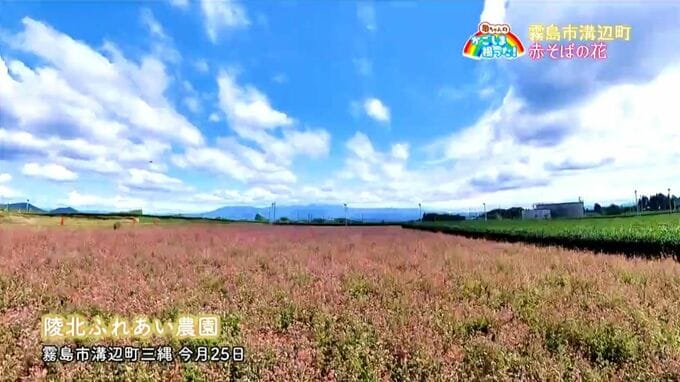 こちらは霧島市溝辺町三縄の「陵北ふれあい農園」です。赤そばの花が見ごろを迎え、畑一面がまるで赤いじゅうたんのようです。
