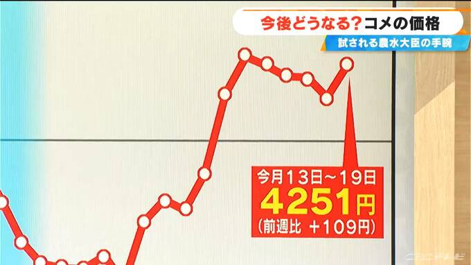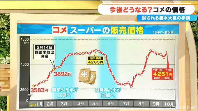 コメのスーパーでの販売価格、5キロでいくらかという数字ですが、一時備蓄米の投入もあって3500円台まで下がったんですが、また上がってきて現在高止まり、最新(10月13日~19日)では、5キロで4251円(前週比 +109円)となっています。