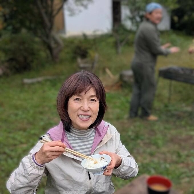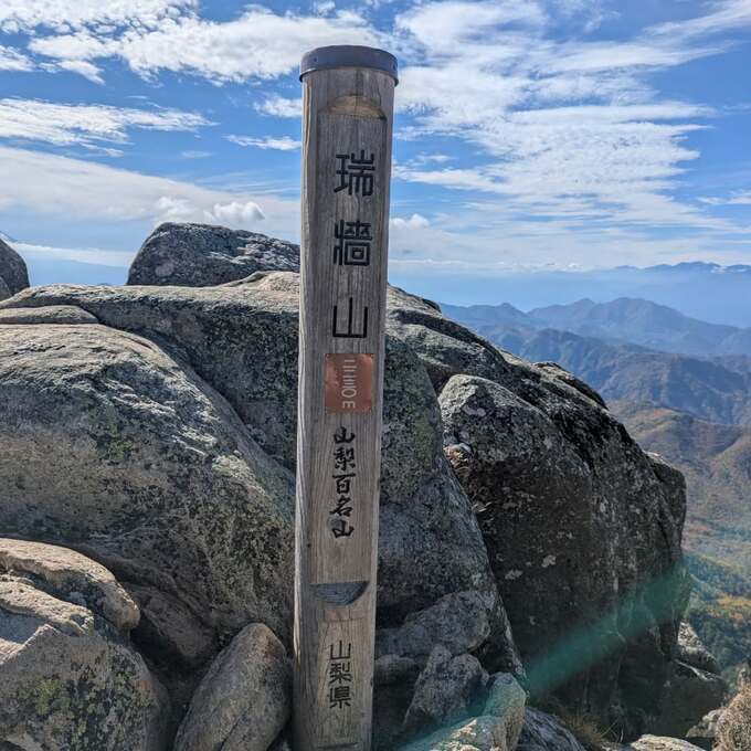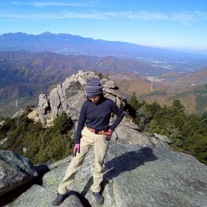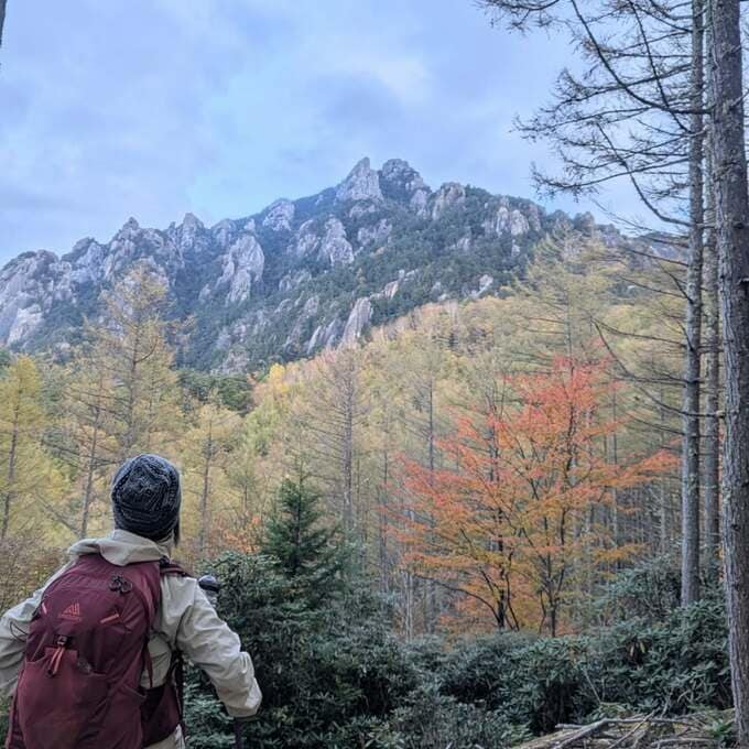 磯野さんは「山梨県の瑞牆山(みずがきやま)に登ってきました」とテキスト。1枚目には、紅葉する森の向こう側に大きくそびえ立つ岩山の写真を投稿し、「この山は岩が多くて、頂上まで岩!」と伝えています。