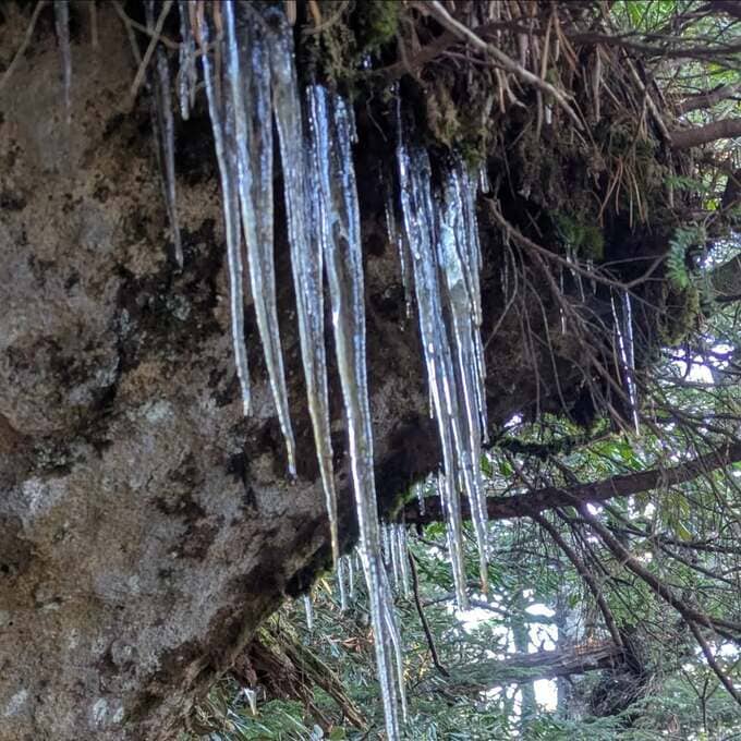 磯野さんは山頂周辺と思われる場所に立つ写真と共に「岩場を登るのに、ゴム軍手が役に立ちました」と現場ならではの実感を伝え、それと共に「山頂直下に出来ていた、つらら」の写真も投稿。「山はもう冬が来てました」と、急な季節の移り変わりを伝えています。