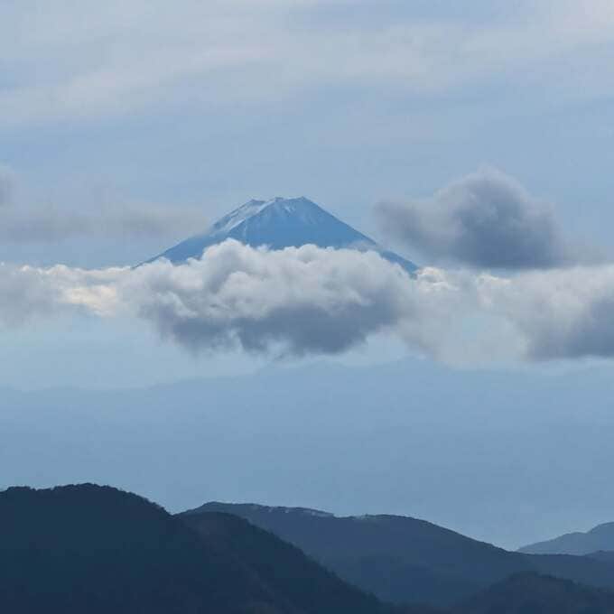 磯野さんは、大きな岩の割れ目に挟まったような格好で驚き半分おどけ半分のようなポーズを投稿。そして登頂した証の山頂標識を撮影し「山頂からの富士山」も投稿しています。