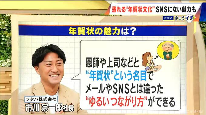 年賀状の魅力について、フタバの市川宗一郎社長はこう言っています。「恩師や上司などと年賀状という名目で、メールやSNSとは違った“ゆるい繋がり方”ができる」。
