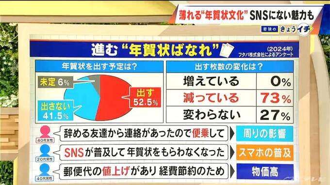 進む年賀状ばなれ。2024年のフタバ株式会社によるアンケートによりますと、年賀状を出す予定は、52.5%が出す、41.5%が出さない、6%が未定と答えています。出す枚数は、増えているが0%、減っているが73%、変わらないが27%。