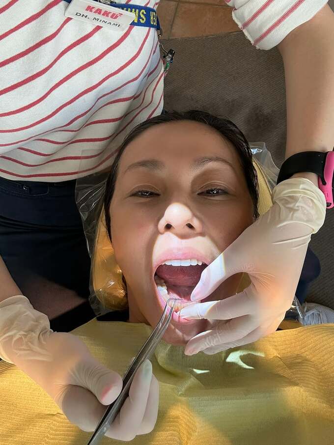 RIKACOさんは「こんな顔でごめんなさい でもね 嬉しくてー」と綴ると、歯の処置中の写真をアップ。