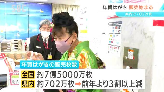 SNSの普及などで販売枚数は全国でおよそ7億5千万枚、県内は702万枚と前の年に比べて3割以上減少しています。
