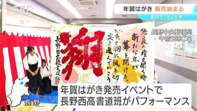 長野市の長野中央郵便局では、長野西高校書道班がパフォーマンスを披露する記念イベントが行われ、年賀はがきの販売が始まりました。