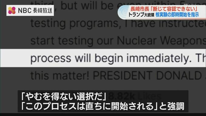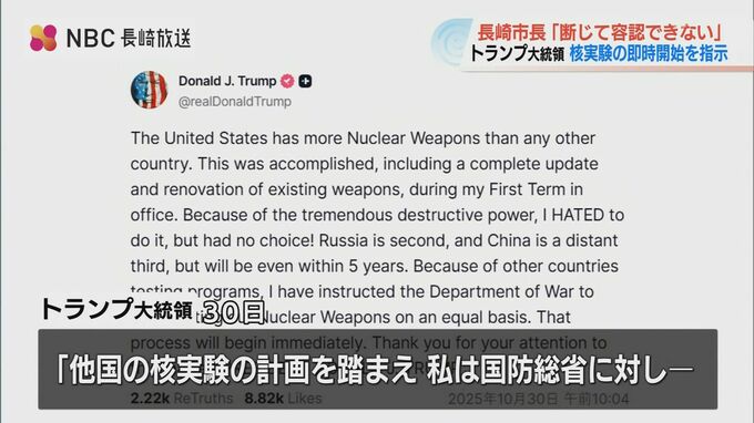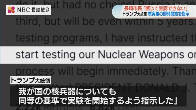 アメリカのトランプ大統領が国防総省に対し、核実験を直ちに開始するよう指示したと明らかにしました。被爆地・長崎からは怒りの声が上がっています。