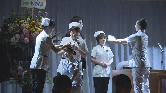 看護学生にナースキャップを贈る戴帽式が行われました。30日、福島市の福島東稜高校で行われたのは、看護師を志す看護学生に対しナースキャップを贈る戴帽式です。これは、これから始まる本格的な実習を前にした区…