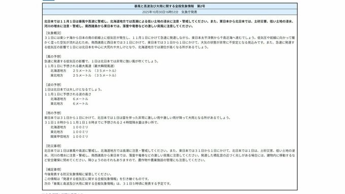 気象庁は30日、「北日本では11月1日は暴風や高波に警戒し、北海道地方では高潮による低い土地の浸水に注意・警戒してください。また、東日本から北日本では、土砂災害、低い土地の浸水、河川の増水に注意・警戒し、南西諸島から東日本では、落雷や竜巻などの激しい突風に注意してください」と発表し注意を呼びかけています。