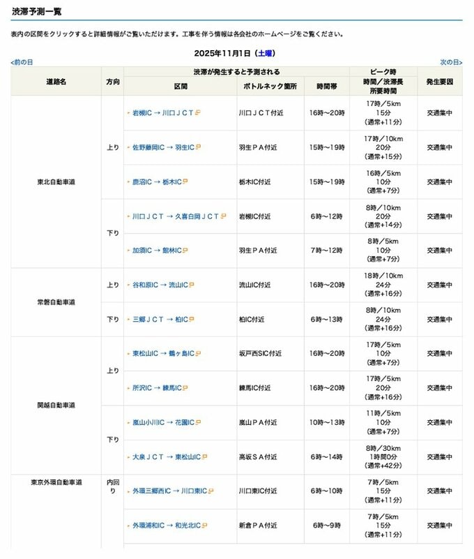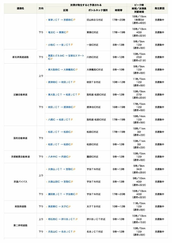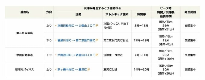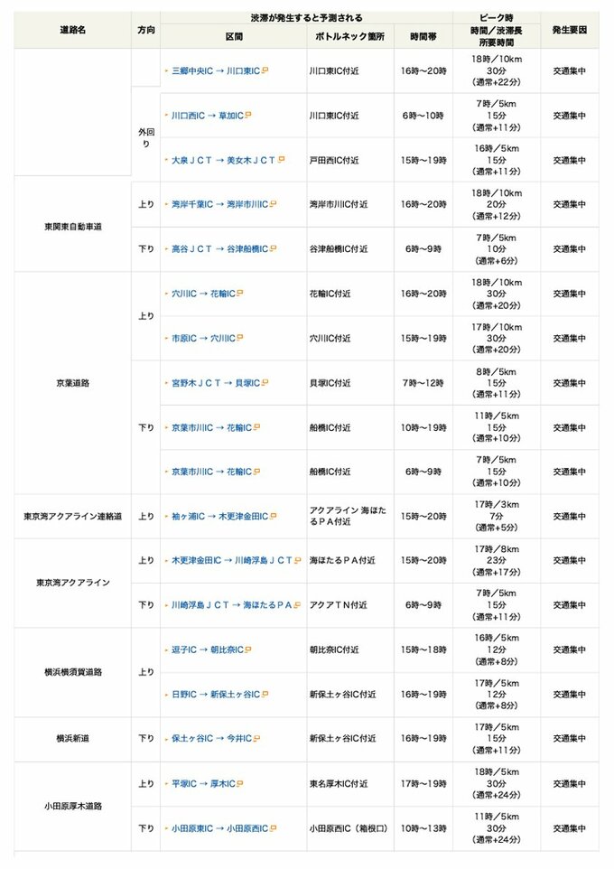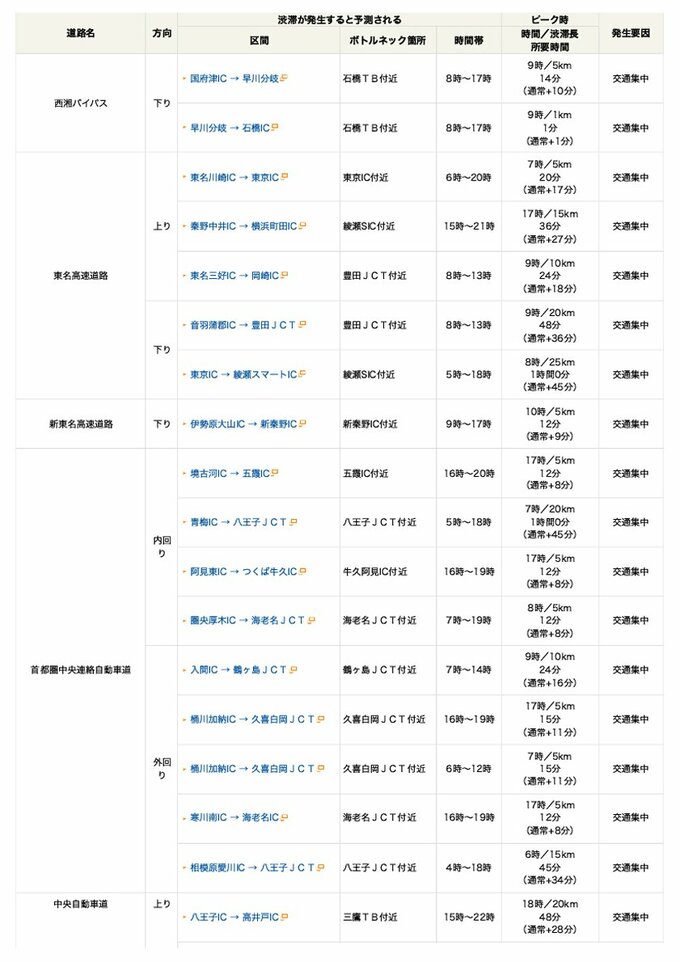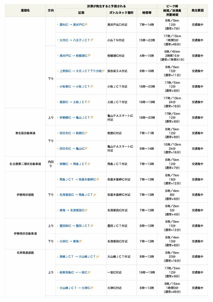 ※工事や事故に伴う渋滞は含まれていませんので、ご注意ください。最新の交通情報は「アイハイウェイ」でNEXCOが提供しています。