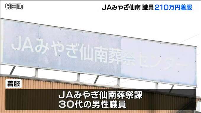 宮城県村田町にあるJAみやぎ仙南によりますと、葬祭課に勤務する30代の男性職員は1月から9月にかけて葬儀の利用者8人に対して返礼品などのサービス料を口頭で請求して現金約210万円を受け取り着服したということです。