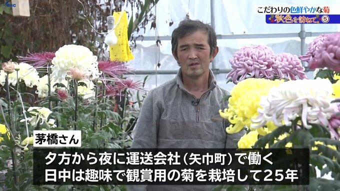 茅橋さんは夕方から夜に矢巾町の運送会社で働きながら、日中は趣味で観賞用の菊を栽培する、この道25年のベテランです。