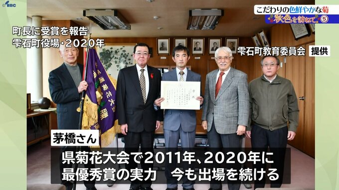 2025年で52回を数える県菊花大会では、2011年と2020年に最優秀賞に輝いた実力の持ち主で、審査員を務めながら出場を続けています。